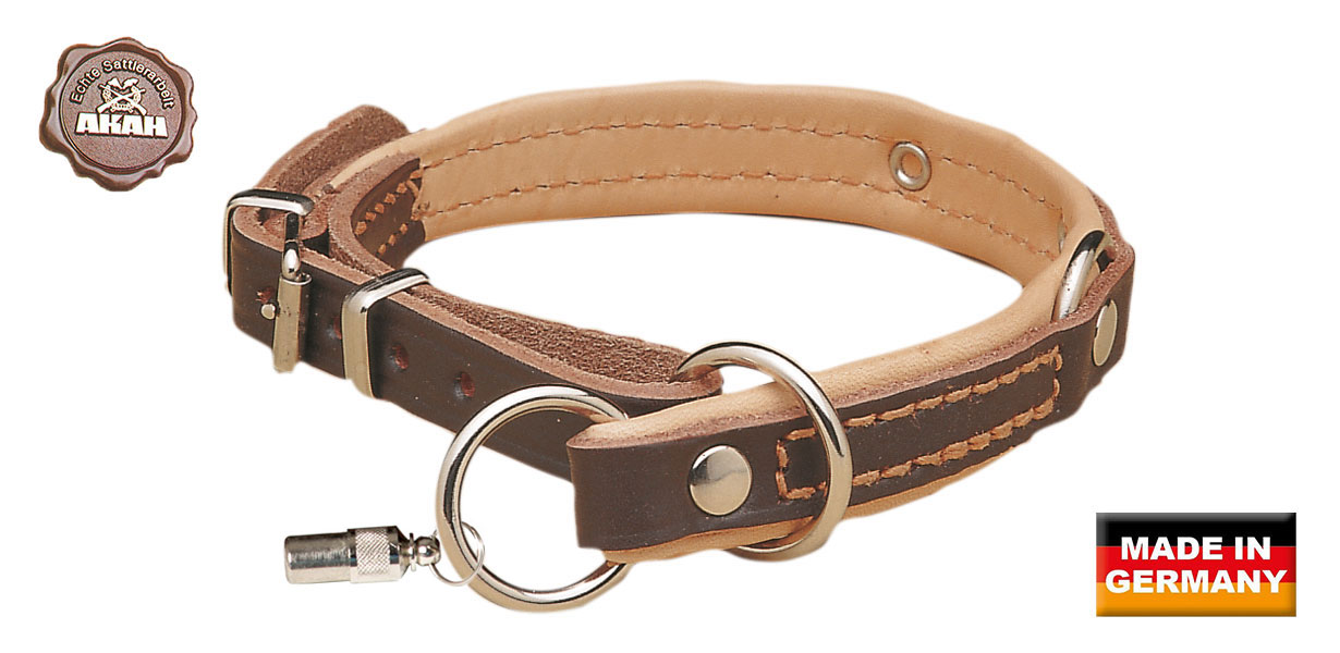 Dieser Begrenzungswürger aus stark gefettetem Sattelleder ist mit weichem Fahlleder gefüttert. Die Halsung ist handgenäht und im Gegensatz zu einer Maschinennaht extrem belastbar.