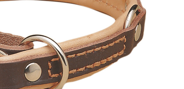 Dieser Begrenzungswürger aus stark gefettetem Sattelleder ist mit weichem Fahlleder gefüttert. Die Halsung ist handgenäht und im Gegensatz zu einer Maschinennaht extrem belastbar.