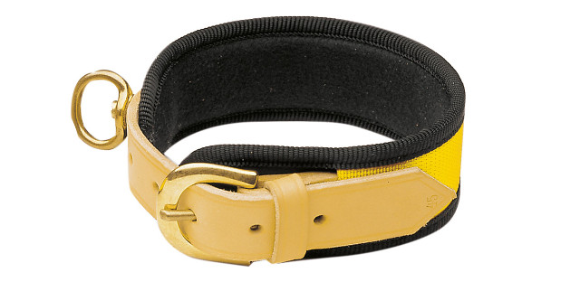 Das durchgehende Lederhalsband aus festem, ökologisch gegerbtem Fahlleder wurde mit weichem Fleece gepolstert. Die Kanten wurden mit Nylonband hautfreundlich gearbeitet. Die Oberfläche wurde mit neongelbem Gurtband für eine gute Sichtbarkeit kenntlich gemacht.