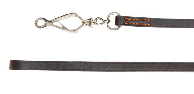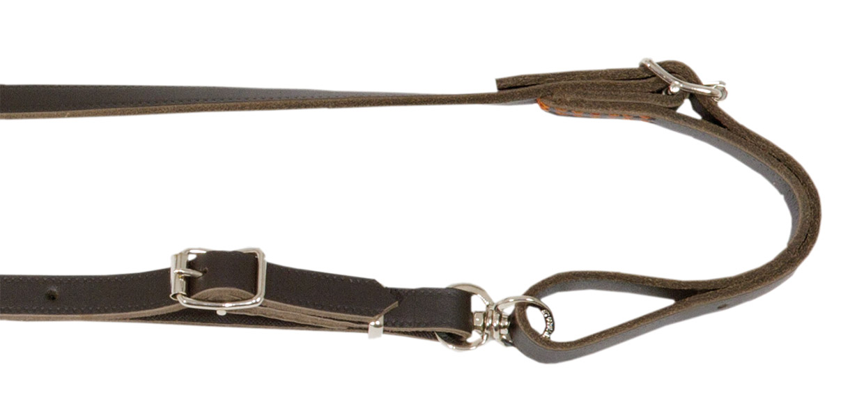 Die dunkelbraune längenverstellbare Umhängeleine aus ökologisch gegerbtem Vollrindleder ist sehr reißfest und geschmeidig und liegt gut in der Hand.