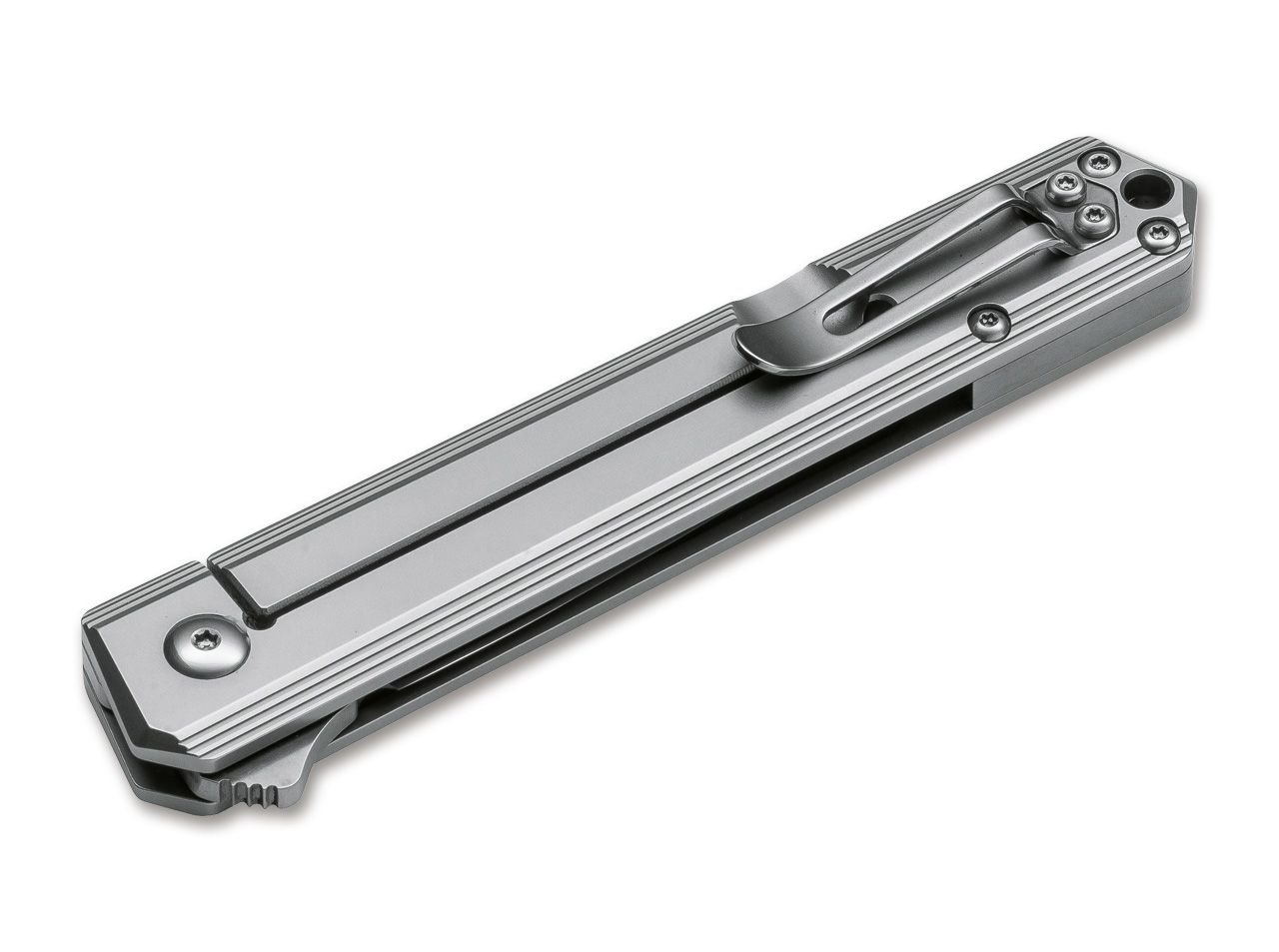 Die ungebrochene Popularität des Kwaiken Flippers von Lucas Burnley hat uns bereits eine Vielzahl von Varianten beschert. Ganz oben auf der Wunschliste unserer Kunden stand eine besonders schlanke Version, die bei gleichbleibender Größe noch mehr Tragekomfort bietet. So haben wir uns zusammen mit Lucas Burnley an die Verwirklichung des Böker Plus Kwaiken Framelock gemacht. Durch den Verzicht auf eine separate Platine konnten wir die griffdicke des Kwaiken hier noch einmal deutlich reduzieren. Durch die elegante Facettenfräsung der Edelstahlgriffschalen wirkt das Messer dennoch nie kantig in der Hand, sondern begeistert mit einer ausgezeichneten Haptik. Die kugelgelagerte Klinge wird aus D2 gefertigt und trägt ein feines Satin-Finish. Der sanft mattierte Griff trägt einen abnehmbaren Clip (Tip-up/r).