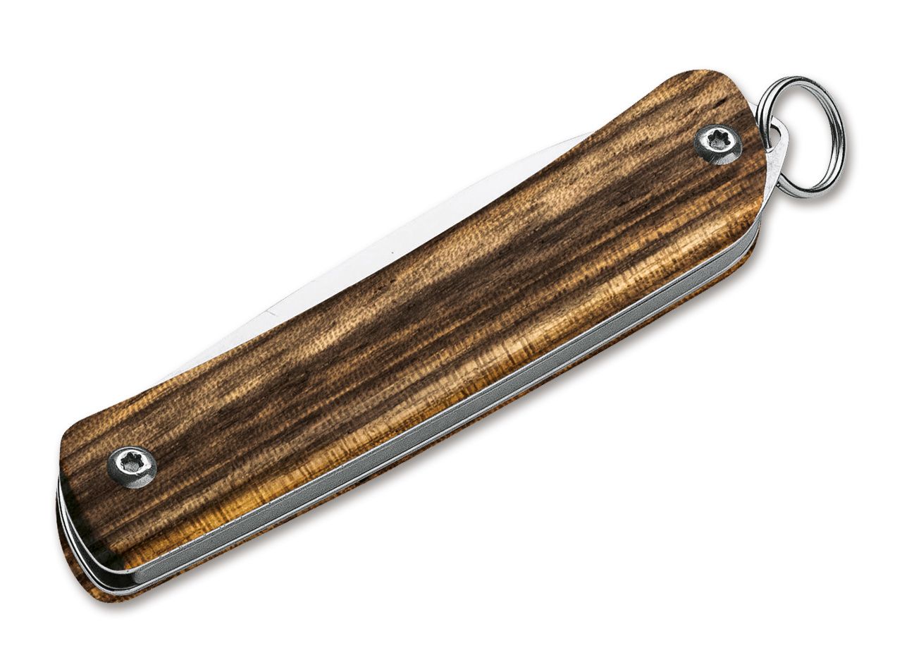Mit 5,2 Zentimetern Klingenlänge ist das Böker Plus Mini Tech Tool deutlich vielseitiger, alltagstauglicher und effektiver als viele bekannte Schlüsselbundmesser, liegt jedoch immer noch absolut innerhalb des Größenbereichs, der auch für den Schlüsselbund prädestiniert ist. Die gleichen hochwertigen Ausstattungsmerkmale wie beim großen Bruder zeichnen auch die kleine Version des Tech Tool aus. Griffschalen aus hochwertigem Zebraholz machen aus dem technisch anmutenden Böker Plus Tech Tool ein edles Gentlemanmesser. Das helle Holz überzeugt mit einer klaren, länglichen Maserung und ist so absolut westentaschentauglich. Die polierte und hohlgeschliffene Klinge aus Sandvik 12C27 und eine feste Öse samt Schlüsselring gehören beim Mini Tech Tool zum Standard.