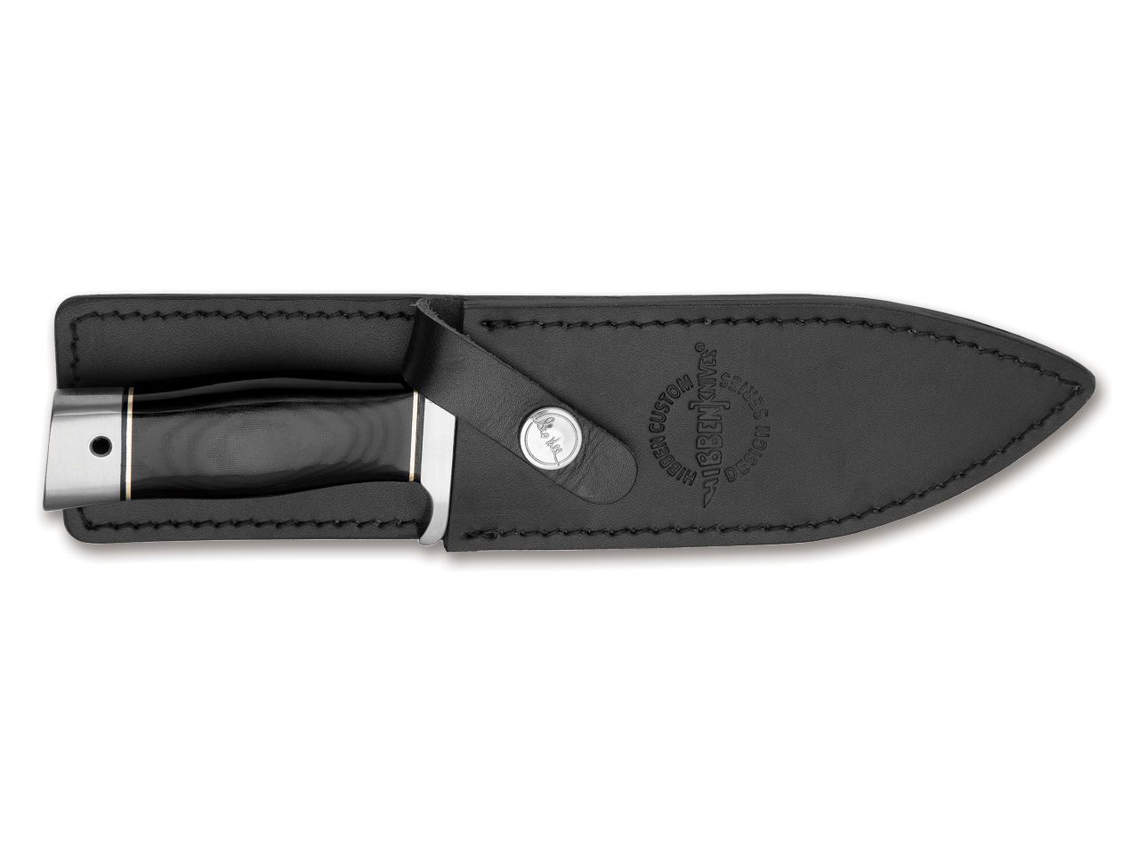 Das kompakte Alaskan Boot Knife von Altmeister Gil Hibben besitzt einen dynamischen Klingenschliff, der die Besonderheit des Messers unterstreicht und Hibbens Handschrift deutlich erkennen lässt. Der Griff besteht aus schwarzem Leinenmicarta, das mit zwei silberfarben kontrastierenden Ringen unterlegt ist. Knauf und Handschutz sind aus Edelstahl gefertigt. Die Lederscheide besitzt einen stabilen Stahlclip für unterschiedliche Trageweisen.