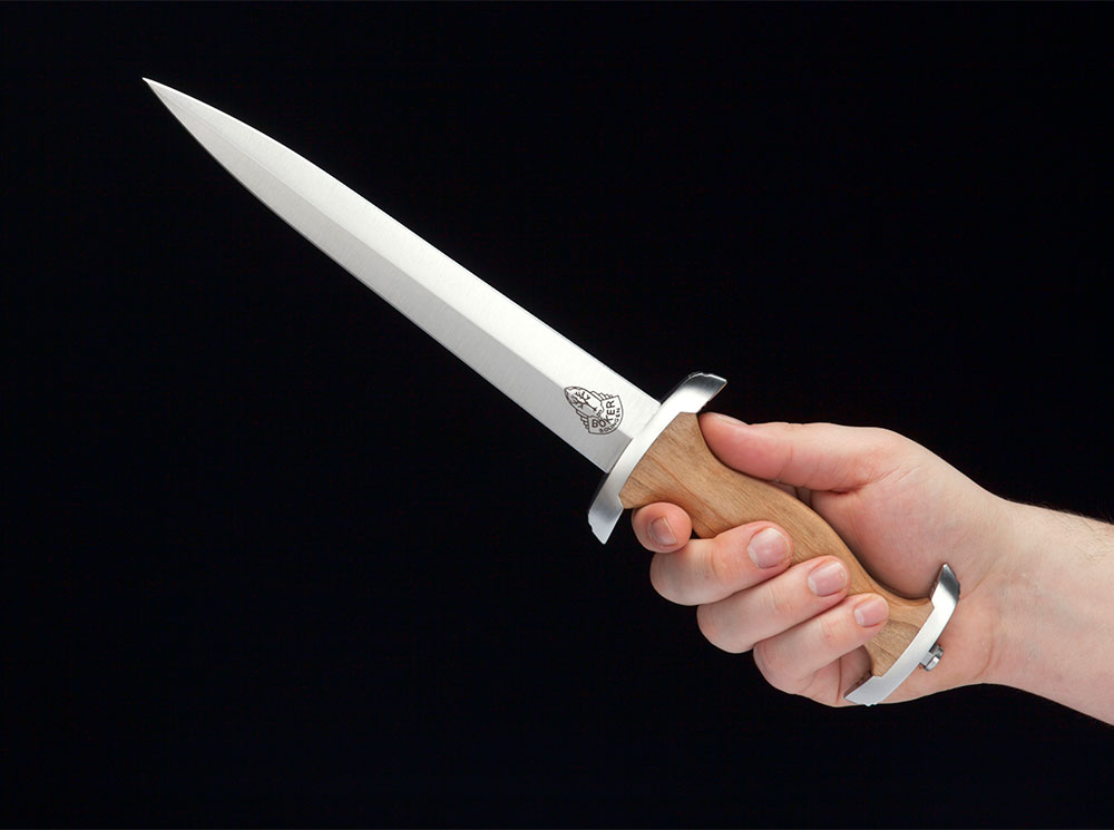 Der Schweizer Dolch war eine gängige Waffe der Schweizer Pikeniere im 15. und 16. Jahrhundert, der aufgrund seiner Klingenlänge oftmals eine Mittelstellung zwischen Dolch und Schwert einnahm. Der auch als Baselard bekannte Dolch wurde für gewöhnlich nicht als Ausrüstungsgegenstand ausgegeben, sondern musste privat von den Soldaten beschafft werden und dienten dann als Sekundärwaffe. Charakteristisch für den Schweizer Dolch ist die Gestaltung von Handschutz und Abschlussknauf. Die außergewöhnliche, gekrümmte Formgebung kann bis in das frühe 13. Jahrhundert zurückverfolgt werden und lässt sich auch in der authentischen Formgebung der von uns in Handarbeit gefertigten Neuauflage wiederfinden. Für die Griffschalen des Dolches wird handverlesenes heinisches Kirschholz verarbeitet, das sich insbesondere wegen seiner rötlichen Farbe bereits seit der Antike großer Beliebtheit erfreut. Die beidseitig geschärfte und spitz zulaufende Dolchklinge wies schon bei historischen Modellen einen Querschnitt in Form eines Diamanten auf, denn diese Konstruktion erwies sich als äußerst stabil und effektiv. Sie wird aus dem klassischen Kohlenstoffstahl C75 gefertigt und beeindruckt schon allein aufgrund ihrer Länge. Die Klinge ist satiniert und trägt eine historische Böker-Klingenzeichnung. Das Logo und die individuelle Seriennummer garantieren die Authentizität des Messers und stehen für eine gleichbleibend hohe Fertigungsqualität. Mit aufwendiger Metallscheide.