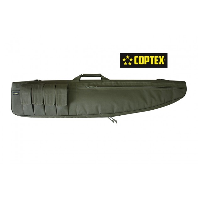 COPTEX Gewehrfutteral PRO COPTEX Gewehrfutteral gefüttert mit vier aufgesetzten Magazintaschen. Seitlich der Magazintaschen findet sich ein großes Fach mit Reißverschluss für Putzzeug, Dokumente oder andere Utensilien. Hauptfach mit 2-Wege Reißverschluss. Zusätzlich gibt es noch ein 10 cm breites und 14 cm tiefes Steckfach Im Inneren des Futterals gibt es vier Klett-Halteschlaufen um das Gewehr zu fixieren. Ein abnehmbarer, verstellbarer und gepolsterter Trageriemen gewährleistet einen sicheren Transport. Größe: 120 x 23 cm , Material: Nylon, Farbe: ODG (grün), Gewicht: 1160g