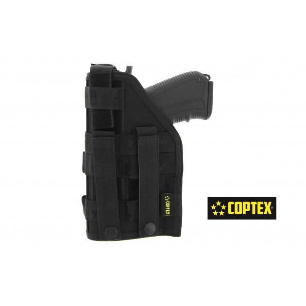 Gürtelholster COPTEX für gr. Faustfeuerwaffen passend für Rechts,- u. Linkshänder. Molle System tauglich. Aus schwarzem Polyester.