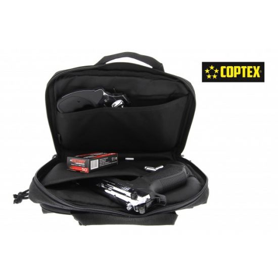 BESCHREIBUNG COPTEX Pistolentasche Zum sicheren Transport von Kurzwaffen oder eines Tablets eignet sich die Tasche von Coptex ideal. Das Hauptfach mit zwei großen Steckfächern ist komplett gepolstert und verhindert somit Beschädigungen. Im Mittelfach finden sich fünf Gummizüge z. B. für Stifte, Magazine oder eine Taschenlampe. In der Fronttasche finden Ausweise und Dokumente ihren Platz. Die Tasche hat links und rechts an der Frontseite ein Laser Cut-Aufnahmesystem. Das spezielle Laser Cut-System sorgt für schnelleres und unkompliziertes Anbringen von Ausrüstungsgegenständen und ist dem MOLLE-System ähnlich. Material: 100% Nylon Maße: 25 x 33 x 9 cm Gewicht: ca. 500g