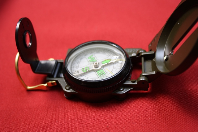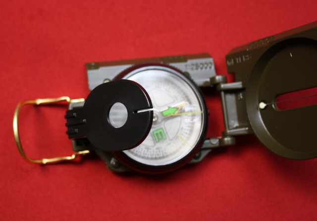 Nato-oliver Flüssigkeitsgedämpfter Marschkompaß im Metallgehäuse. Mit Lupe damit man die Marschzahl beim anvisieren gut ablesen kann,ggf. auch zum Feuer machen. Mit Daumenring zum visieren und einer Anschlagkante zum einnorden und messen von Karten.