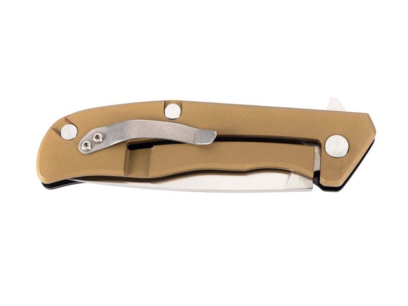 Bei diesem Einhandmesser aus der Herbertz TOP Collection treffen modernes Design auf hochwertige Materialen und präzise Verarbeitung. Die satinierte Klinge mit Flachschliff wird aus rostfreiem AISI 440 Stahl gefertigt. Über einen Flipper, welcher im geöffneten Zustand auch als Fingerschutz fungiert, kann die Klinge dank einer kugelgelagerten Achse elegant in Arbeitsposition gebracht werden. Das Heft bilden eine Frontschale aus schwarzem G10 sowie eine rückseitige Edelstahlplatine mit integriertem Frame Lock in matt goldener Titanbeschichtung. Das Messer wird mit einem Edelstahl Taschenclip im Stone Wash Finish und einem Nylonetui in einer schönen Geschenkbox geliefert.