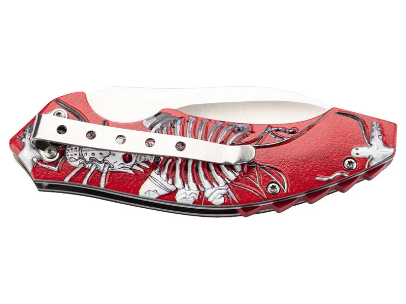 Ein außergewöhnliches Taschenmesser aus dem Hause Herbertz. Die satinierte Hawkbill Klinge aus rostfreiem AISI 420 Stahl ist mit einer Teilsägezahnung ausgestattet und wird über einen Liner Lock Mechanismus zuverlässig arretiert. Der Griff ist mit Aluminium Heftschalen ausgestattet, welche ein kybernetisches Skelett darstellen. Ein Edelstahl Taschenclip rundet die Ausstattung ab.