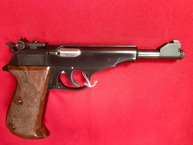 Kal. .22lr. Die 1. Sportpistole von Walther basierend auf der berühmten PP. Mit verstellbarem Visier, 150mm langem Lauf und einem sehr guten Single Action Match-Abzug. Anatomisch geformter Kunststoffgriff mit Daumenauflage. Visierlänge: ca. 185mm Die Waffe ist Zustand 1 = sehr gut. Wenig geschossen. Im Original Koffer. (mit roten Samt ausgeschlagen, etwas beschädigt) Beschussjahr 1966