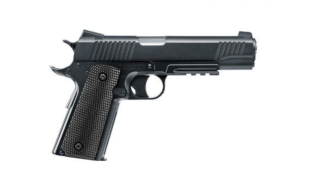 Eine klassische 1911-Version für 22 BBs, mit schwerem Metallschlitten, funktionierender Handballensicherung und Picatinny-Schiene vor dem Abzugsbügel. Kaliber : 4,5 mm (.177) BB Antrieb : CO2 Magazinkapazität : 22 Schuss Sicherung : Schlagbolzensicherung Länge : 220 mm Lauflänge : 127 mm Gewicht : 845 g Geschossgeschwindigkeit : 125 m/s Abzug : Double-Action Besonderheit(en) : Non Blow Back Schussanzahl pro Co2 Kapsel ca.120 Schuss (abhängig von Umgebungstemperatur, Feuerrate und Qualität des CO2)Schuss pro Kartusche Energie : 2,6 Joule