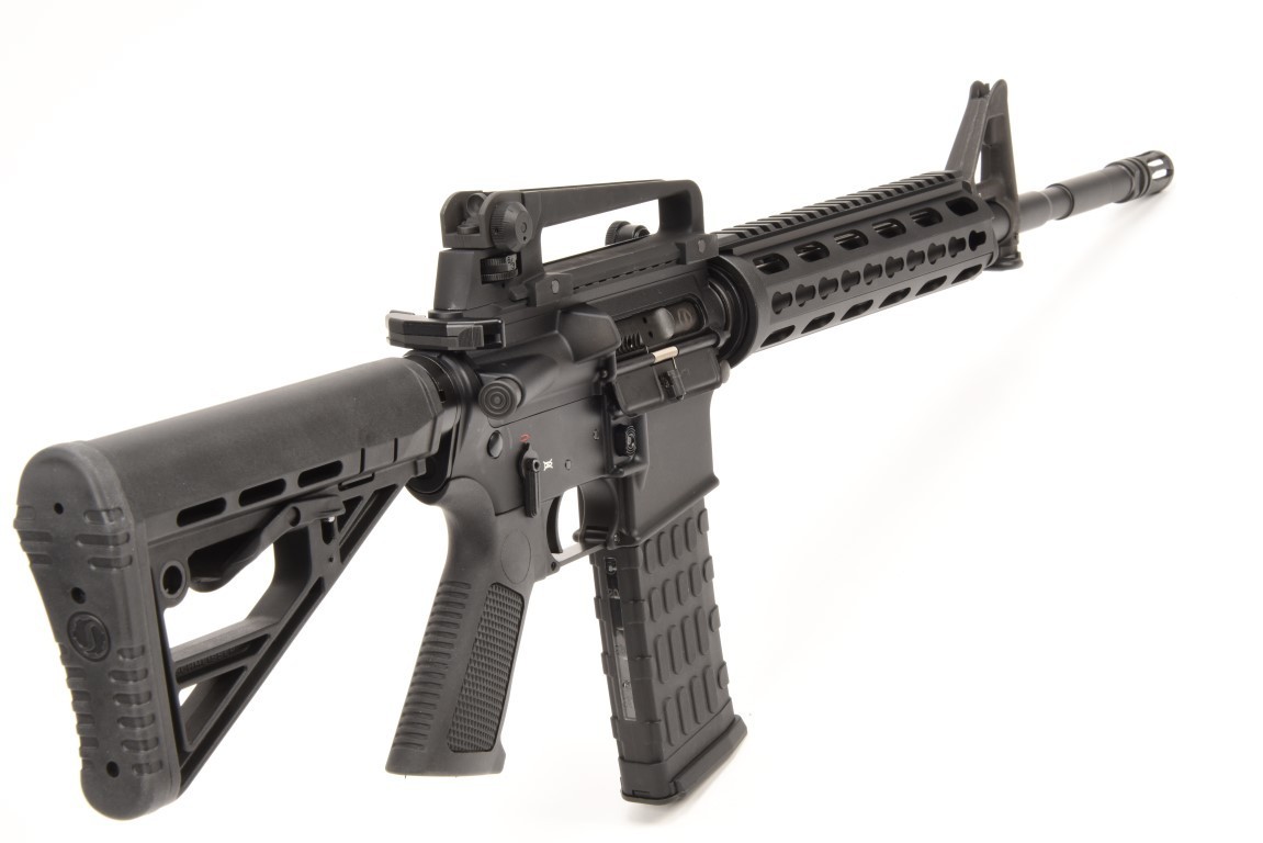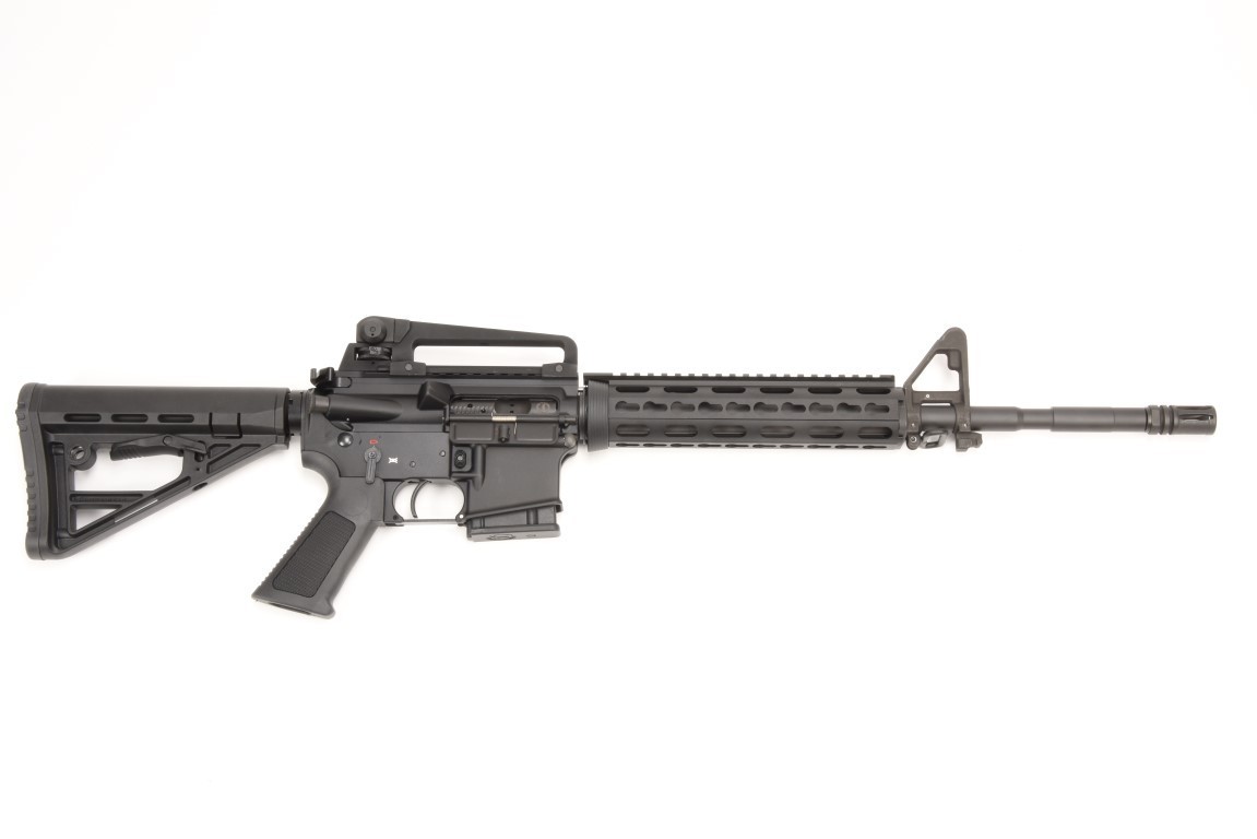 Kal..223Rem. AR15 Modell M5, Selbstladebüchse nach Mil-Spec, Gasdrucklader. Daten: Gesamtlänge 94cm, mit eingeschobenenem Schaft 84cm. Gewicht ca. 3,8 Kg. Kal. .223 Rem. Gehäuse: Nach Mil-Spec Gesenk geschmiedetes Gehäuseunter- und -oberteil (Lower/Upper) aus 7075 T6 Aluminium gefräst und harteloxiert. Lauf: Abgestufter Lauf mit 1/9 Drall, matt schwarz brüniert. Lauflänge 42,5 cm (16,75'). Ausstattung: Mündungsfeuerdämpfer, fester Kornträger, abnehmbarer Tragegriff inkl. Visier, Quad-Rail-Handschutz mit Vollabdeckungen, einschiebbarer 6- Positionen Schaft, Pistolengriff mit Staufach. Lieferumfang: 2- oder 10- Schussmagazin,Koffer, Reinigungsset,Sicherheitsflagge Hinweis: Auslieferung derzeit entgegen der Abbildung mit Quadrail-Vorderschaft