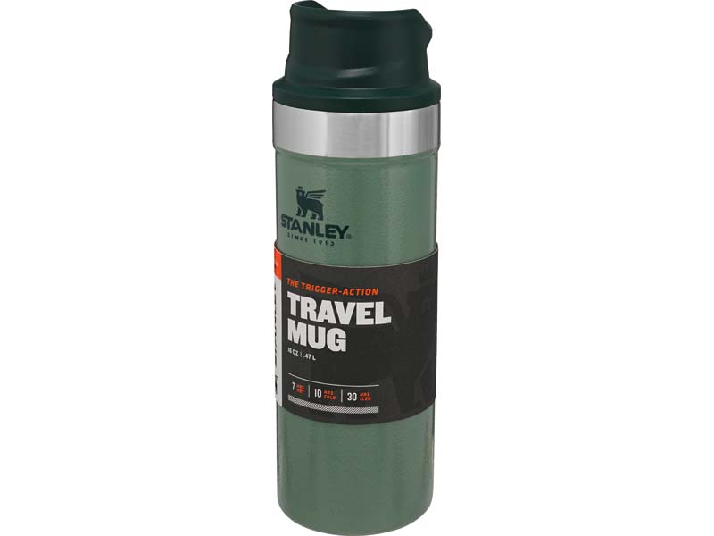 Mit dem Stanley CLASSIC TRIGGER-ACTION TRAVEL MUG in Hammertone Green führt Stanley eine neue Generation der Becher mit Einhandbedienung ein. Das Drücken der großen und sehr leichtgängigen Taste zum Aktivieren der Trinköffnung mit einer Hand macht Trinken - on the go - zum Vergnügen. Der Trinkbecher aus rostfreiem 18/8-Edelstahl mit Vakuumisolierung besitzt ein Fassungsvermögen von 473 ml und hält Getränke bis zu 7 Stunden heiß oder sogar 10 Stunden gekühlt. Der TRIGGER-ACTION TRAVEL MUG ist komplett spülmaschinenfest, auslaufsicher und passt in gängige PKW-Getränkehalterungen. BPA-frei.