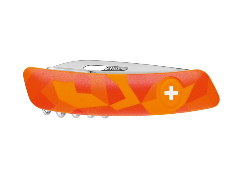 SWIZA C03 LUCEO Camo Urban Orange - das neue Schweizer Taschenmesser. Hergestellt in der Schweiz auf modernsten Produktionsanlagen, verfügt das Messer über eine tolle Funktionalität: Höchste Sicherheit, da die 75mm lange Klinge aus Edelstahl 440 (gehärtet auf 57 HRC) arretiert und sich durch Druck auf das Schweizer Kreuz - Markenzeichen von Swiza - wieder einklappen lässt. Die leichte Krümmung des Messers ermöglicht ein müheloses Aufklappen aller Werkzeuge, die Anti-Rutsch-Oberfläche erleichtert eine intuitive Handhabung. Das C03 besitzt außerdem eine Stech- und Bohrahle, die Kombi-Werkzeuge Flaschenöffner/Schlitzschraubenzieher Nummer 3 sowie Dosenöffner/Schlitzschraubendreher Nummer 1, eine Pinzette mit abgeschrägter Spitze und einen Sommelier-Korkenzieher mit 5 Windungen. C03 - 11 Funktionen: Klinge 75mm, Klinge mit Sicherheitsblockierung, Stech- und Bohrahle, Nähahle, Flaschenöffner, Schraubendreher Nr. 3, Drahtbieger, Dosenöffner, Schraubendreher Nr. 1, Sommelier-Korkenzieher, Pinzette