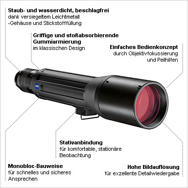 Auflegen, Durchblicken, Scharfstellen - das neue Kompakt-Spektiv Dialyt 18-45x65 bringt den Beobachter blitzschnell an alle Details heran, auch wenn sie in weiter Ferne liegen. Es eignet sich ideal für mobile Naturbeobachter, Jäger, Sportschützen und Hobby-Astronomen, denen eine schnelle und flexible Handhabung - auch ohne Stativ - besonders wichtig ist. Für längere Beobachtungen und stationären Einsatz empfiehlt sich die Verwendung des neuen Aluminiumstativs von Carl Zeiss. Blitzschnell einsatzbereit Die Bedienung des Dialyt Spektivs geht besonders leicht von der Hand, mit einem Griff ist das Gerät einsatzbereit. Ob schnelles Anlegen an einem Baum oder lautloses Auflegen auf Rucksack oder Tasche - das Kompakt-Spektiv sorgt für blitzschnelles Erfassen. Dank der Peilhilfe am Objektiv kann die Vergrößerung dabei im hohen Vergrößerungsbereich verbleiben. Das Fokussieren am Objektiv führt zu einer besonders stabilen Haltung beim Beobachten. Dank der leichten, kompakten Monobloc-Bauweise im unverkennbar klassischen Design der Dialyt-Familie, lässt sich das Dialyt 18 - 45 x 65 problemlos transportieren und eignet sich so auch als besonders mobiles Reise- oder Zweitspektiv. Das wasser- und staubdichte Gehäuse qualifiziert es für den intensiven Einsatz unter rauen Bedingungen. Feinste Details schnell erfassen Das Kompakt-Spektiv mit hochwertiger Optik von Carl Zeiss ist ohne weitere Handgriffe sofort einsatzbereit und auch lang genug, um es stabil aufzulegen. Die Objektivfokussierung und die Peilhilfe unterstützen das schnelle Erfassen. Das variable Okular mit 18 bis 45-facher Vergrößerung begeistert bei geringer Vergrößerung mit einem großen Sehfeld und bei hoher Vergrößerung mit detailstarken Bildern. Die neu gerechnete, in modernen Mehrschichtverfahren vergütete Optik gewährleistet eine hohe Lichttransmission für helles und detailreiches Beobachten auch am frühen Morgen oder am späten Abend. Technische Daten: Dialyt 18 - 45 x 65 Vergrößerung: 18 - 45x Objektivdurchmesser: 65 mm Austrittspupillen-Durchmesser: 3,61 - 1,44 mm Abstand der Austrittspupille: 19 mm Sehfeld auf 1.000 m: 40 m - 23 m Subjektiver Sehwinkel: 39,5 ° - 56,5 ° Naheinstellgrenze: 10 m Dioptrien-Verstellbereich: +/- 5 dpt Prismensystem: Schmidt-Pechan Innengewinde: für Filter M67 x 0,75 LotuTec®: nein Stickstofffüllung: ja Wasserdichtigkeit: 400 mbar Funktionstemperatur: -25 / +55 °C Gewicht: 1.195 g Länge: 395 mm Breite: 76 mm Höhe: 78 mm