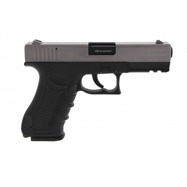 Gas.-und Signalwaffe im Kal.9mm P.A. für Platz und Gaspatronen Farbe: Titan Modell: Zoraki 917 Design ähnlich einer weltbekannten Dienstpistole. Kaliber: 9mm P.A. Knall Magazinkapazität: 17 Schuss Gewicht: ca. 830 gr. Gesamtlänge: 201 mm Abzug: Single/Double-Action Schlitten: Metall Griff: Polymer Moderne Gas-Signalpistole mit ergonomischem Polymergriffstück. Die Pistole besitzt einen Metallschlitten. Sie kann mit wenigen Handgriffen zerlegt werden. Die Lieferung erfolgt im Waffenkoffer inkl. Pyrobecher und Reinigungsbürste. Der Erwerb und Besitz aller angebotenen Gas- und Signalwaffen und der dazugehörigen Munition ist erlaubnisfrei ab 18 Jahren. Nur zum führen (z.B. geladen tragen in der Öffentlichkeit)einer Gas- und Signalwaffe, bedarf es einer behördlichen Erlaubnis (kleiner Waffenschein). Der Verkauf ins Ausland ist nur mit gültiger Genehmigung des Ziellandes möglich.